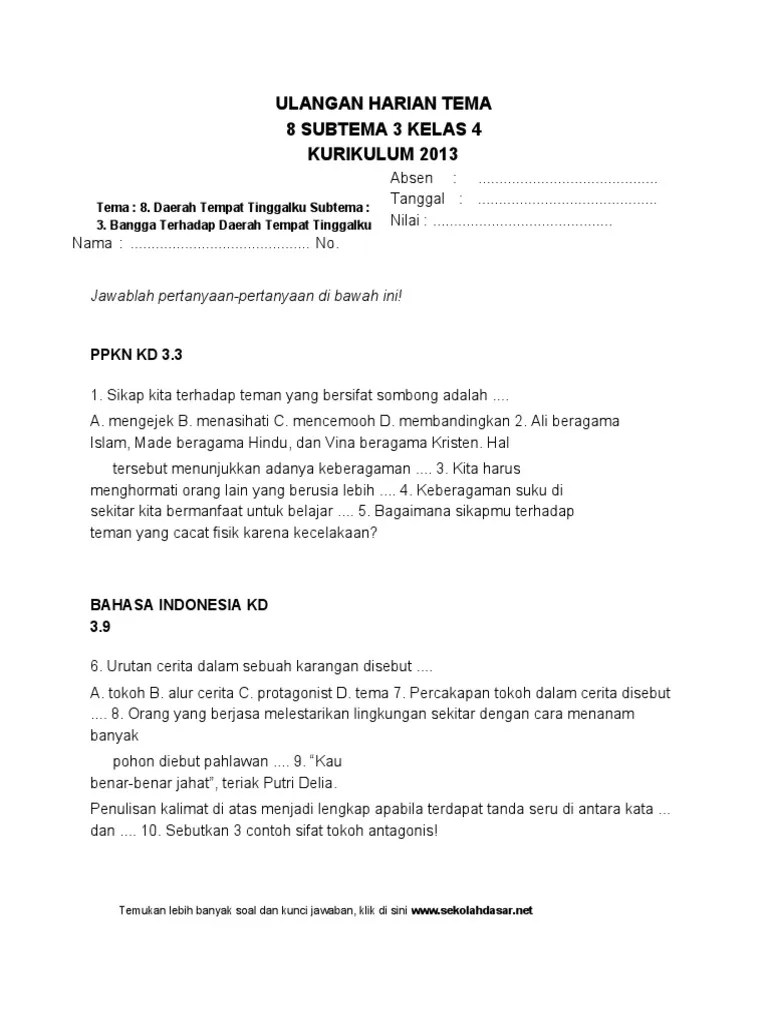 Soal ulangan harian kelas 4 tema 8 kurikulum 2013 revisi 2018 ini.