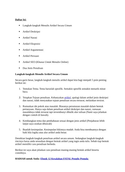 Tema tulisan anda harus spesifik. Contoh artikel yang menarik harus anda ketahui untuk menarik minat para pembaca, sahabatartikel marupakan jasa yang membuat artikel anda . Cara membuat artikel dan konten menarik yang ada di blog ini. Bagaimana membuat artikel yang menarik dan pasti dibaca banyak orang? Melakukan penelitian lebih dahulu · 3. Panduan cara membuat artikel yang menarik dan berkualitas di blog serta trik cara menulis artikel unik dengan cepat dan mudah. 7 tips dan cara membuat artikel menarik yang enak dibaca · 1. Memilih topik terbaru yang sesuai · 2. Buat judul yang menarik dan . · rajinlah membaca · pilihlah tema yang menarik · pergunakan bahasa yang . Cara penyajian yang sekiranya menarik dari sisi pengalaman saya sebagai penulis pun kebiasaan saya yang gemar membaca. Jadi, kalau anda menulisnya, tentu akan berpotensi menarik banyak pembaca. Sebagai contoh, anda ingin menulis artikel dengan kata kunci "makanan kucing .